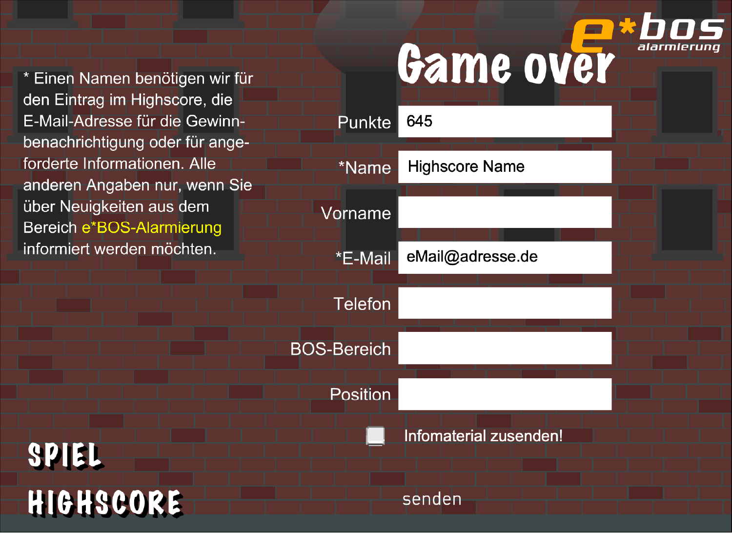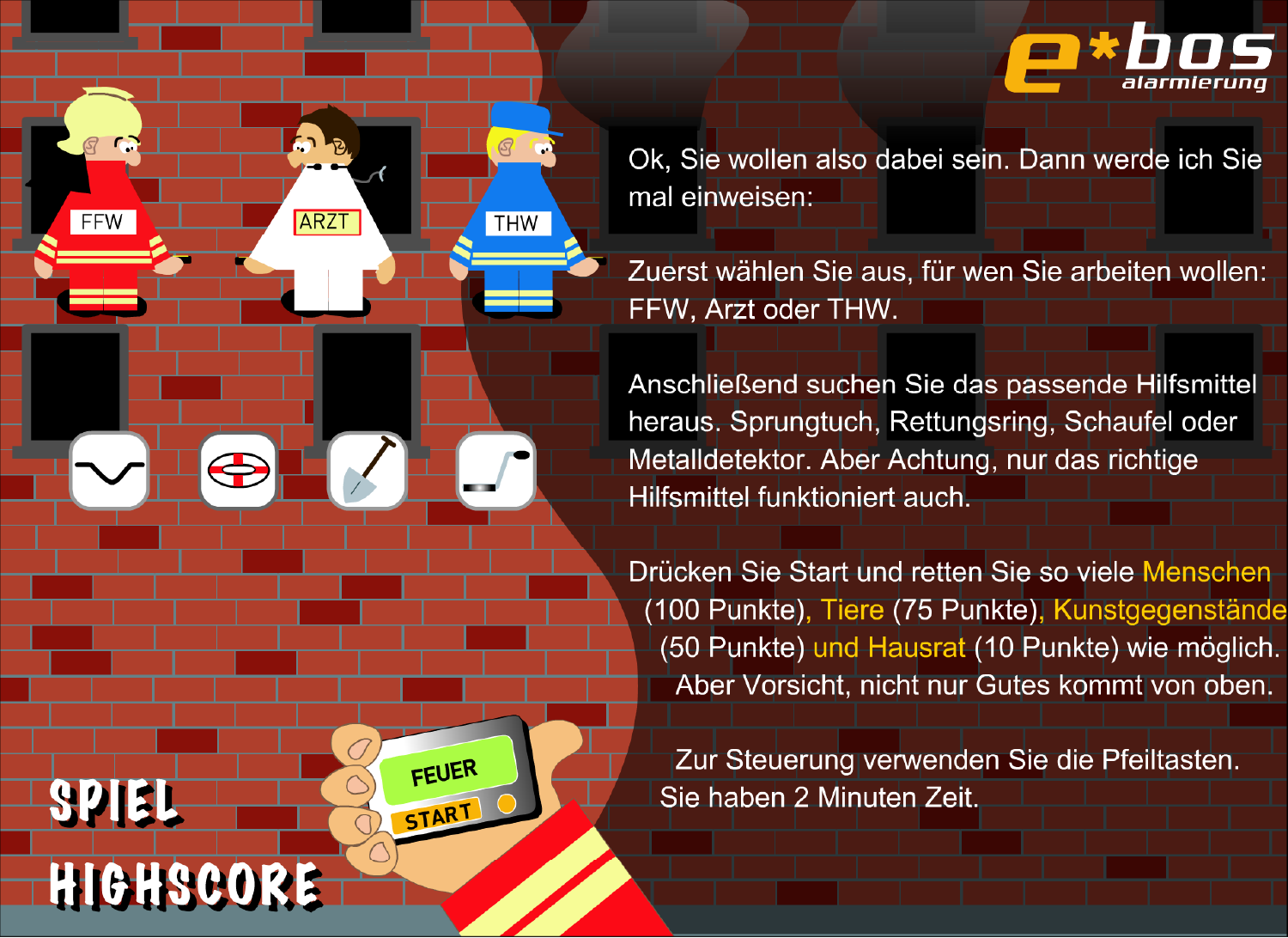 Diese kleinen Online-Spiele entstanden bereits 2004/2005, haben aber immer noch ihren Charme. Ziel der Spiele war es, die Besucher der Website von e*Message länger auf der Seite zu halten und für die eigenen Alarmierungslösungen für BOS [Behörden und Organisationen mit Sicherheitsaufgaben] auf spaßige Weise zu gewinnen. Entsprechend der damaligen Technik wurden sie noch in Flash für den Desktop mit Tastatur programmiert. Heutzutage würde man sie in HTML5 und Smartphone- bzw. Tablet-optimiert umsetzen.